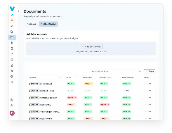 Documents in Vandy are structured based on categories like financial, maintenance, and vehicle-related files. Users can filter, search, and tag documents for easy retrieval. The system also allows linking documents to specific vehicles or drivers, enhancing organization and accessibility. The financial records you have of your fleet can be filtered and exported.