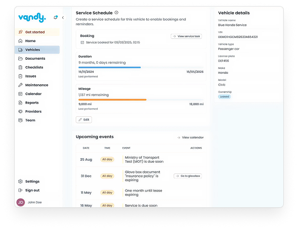 Vehicles maintained on schedule retain 12-18% more value at resale. Vandy’s automated maintenance reminders keep your fleet on service intervals, preventing costly breakdowns and preserving your fleet’s asset value over time.