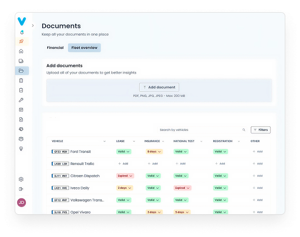 Documents in Vandy are structured based on categories like financial, maintenance, and vehicle-related files. Users can filter, search, and tag documents for easy retrieval. The system also allows linking documents to specific vehicles or drivers, enhancing organization and accessibility. The financial records you have of your fleet can be filtered and exported.