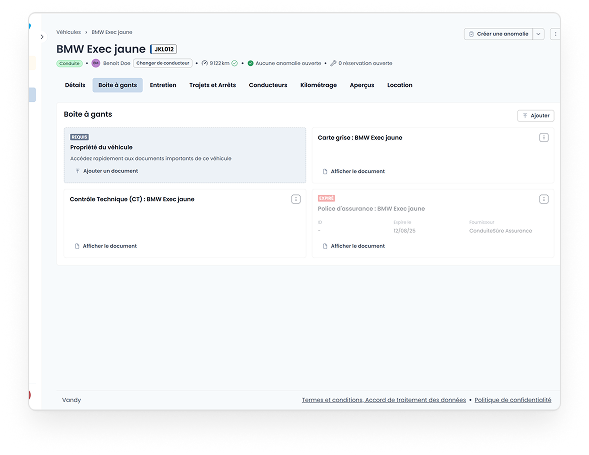 Vandy sécurise la conformité de votre flotte grâce au suivi des documents et à des alertes ciblées.