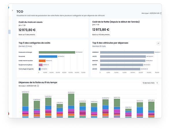 Vandy centralise tous les coûts dans une vision TCO claire et comparable, par véhicule et dans le temps.