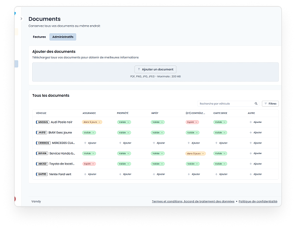 Vandy permet aux utilisateurs de gérer divers types de documents liés à leur flotte, notamment :