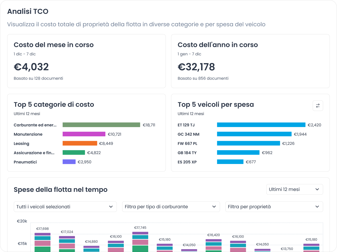 Carburante, manutenzione, riparazioni, leasing, assicurazione, pedaggi, parcheggi, tasse, multe, pneumatici e qualsiasi altra spesa legata alla flotta.