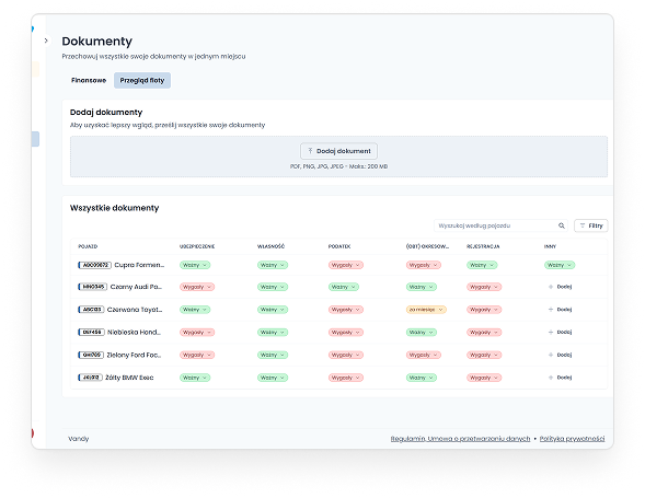 Dokumenty w Vandy są ustrukturyzowane według kategorii, takich jak pliki finansowe, konserwacyjne i związane z pojazdami. Użytkownicy mogą filtrować, wyszukiwać i oznaczać dokumenty, aby ułatwić ich znalezienie. System pozwala też łączyć dokumentów z konkretnymi pojazdami lub kierowcami, usprawniając organizację i dostępność. Dane finansowe floty można filtrować i eksportować.